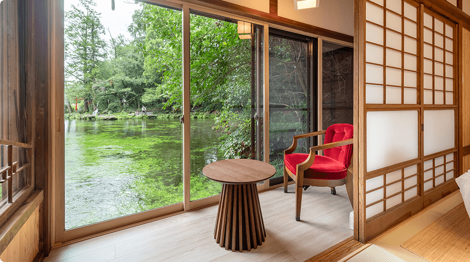 富士山の麓の閑静な場所にあり、浅間大社と一体となっていることで、まるで自然の中にいるかのような体験ができます。